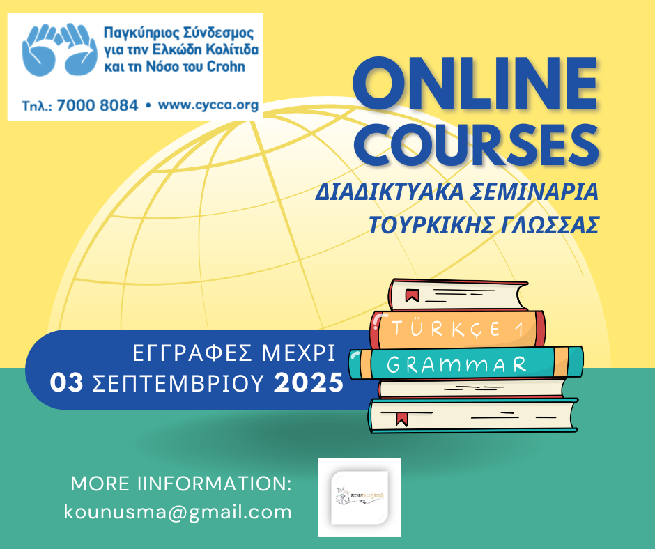 Ο Παγκύπριος Σύνδεσμος για την Ελκώδη Κολίτιδα και τη Νόσο του Crohn (ΠΑ.ΣΥ.Ε.Κ.Κ.), σε συνεργασία με τη διαδικτυακή κοινότητα γλωσσικής μάθησης κουnuşma προσφέρουν δωρεάν σεμινάρια τουρκικής γλώσσας για αρχάριους (ΚΕΠΑ Α1 επίπεδο) αποκλειστικά για τα μέλη του συνδέσμου. Παραμένει ανοιχτή πρόσκληση σε όσους επιθυμούν να γίνουν μέλη του συνδέσμου, συμπληρώνοντας αυτή την φόρμα προκειμένου να επωφεληθούν από τα σεμινάρια τουρκικής γλώσσας.