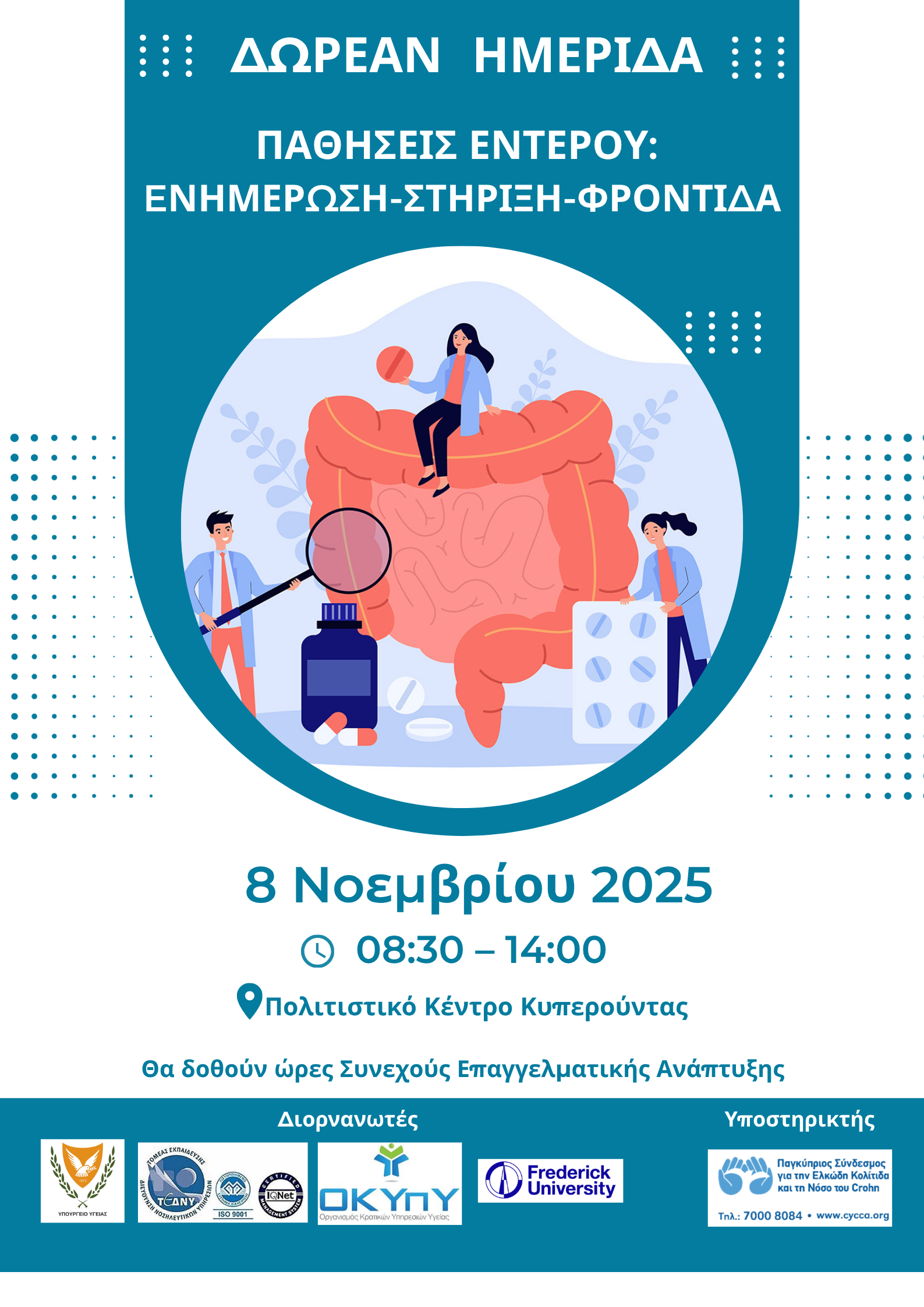 Ο Τομέας Εκπαίδευσης της Διεύθυνσης Νοσηλευτικών Υπηρεσιών του Υπουργείου Υγείας σε συνεργασία με το Frederick University Nursing Department και το Νοσοκομείο Τροόδους OΚΥπΥ και την υποστήριξη του Παγκύπριου Συνδέσμου για την Ελκώδη Κολίτιδα και τη Νόσο του Crohn διοργανώνουν επιστημονική ημερίδα με Θέμα: