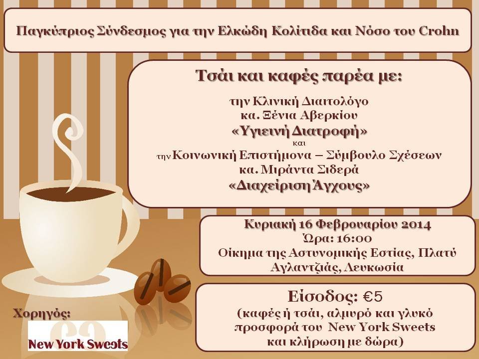 O Παγκύπριος Σύνδεσμος για την Ελκώση Κολίτιδα και την Νόσο του Κρόουνς διοργανώνει εκδήλωση με παρουσίαση ενδιαφερόντων θεμάτων από τις κ.Ξένια Αβερκίου Κλινική Διαιτολόγο και κ.Μιράντα Σιδερά Κοινωνική Επιστήμονα -Σύμβουλο Σχέσεων