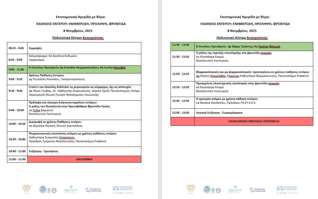 Η εκδήλωση πραγματοποιήθηκε από τον Τομέα Εκπαίδευσης των Νοσηλευτικών Υπηρεσιών του Υπουργείου Υγείας, το Πανεπιστήμιο Frederick, σε συνεργασία με τον Παγκύπριο Σύνδεσμο για την Ελκώδη Κολίτιδα και τη Νόσο του Crohn και τη συμβολή του Νοσοκομείου Τροόδους.