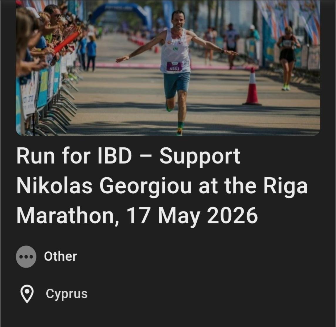 On 17 May 2026, Nikolas Georgiou from Cyprus, at the age of 50, will take on the challenge of running the 42km Riga Marathon in Latvia not just to test his limits, but to make a difference. On World IBD Day, he runs in support of people living with Crohn’s disease and Ulcerative Colitis individuals who face daily challenges with chronic, often invisible conditions.With a personal goal of beating his marathon record of 2:46, this effort goes beyond sport. It is about raising awareness, inspiring others, and supporting a meaningful cause.All funds raised will go directly to the Cyprus Association for Ulcerative Colitis and Crohn s Disease, helping to support patients and strengthen the Association s work.Every donation counts. Every contribution makes an impact.Together, we can raise awareness and stand by those who need it most. A receipt can be issued for every donation.Thank you for being part of this journey.
